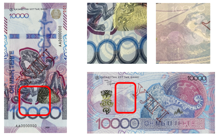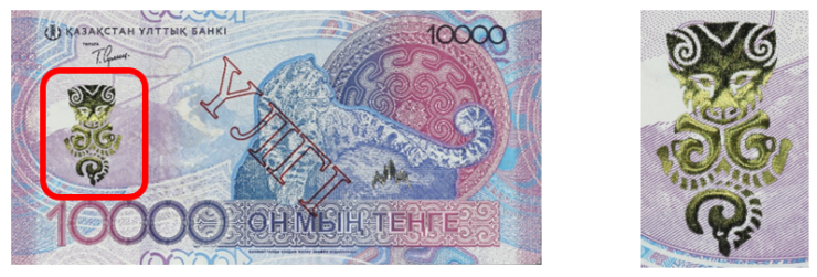Кроме того, на лицевой стороне банкноты расположен защитный элемент – патч в виде объемного изображения стилизованного барса. При повороте банкноты проявляется эффект переключения вершины горы и цифрового изображения номинала на орнамент и динамический эффект расхождения лучей в стороны.