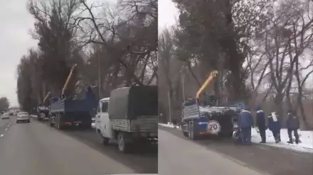 На кадрах рабочие убирают столбы по Кульджинскому тракту в Алматы.