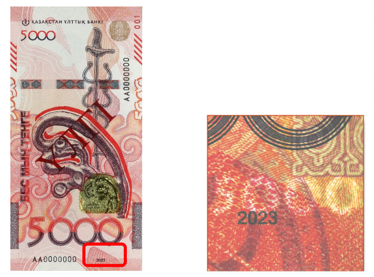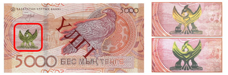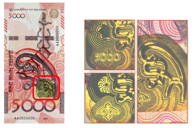 В частности, на банкноте использован специальный вид печати, создающий рельеф, – золотое интаглио. Герб Казахстана нанесен высокорельефным слоем золотистой металлической краски.