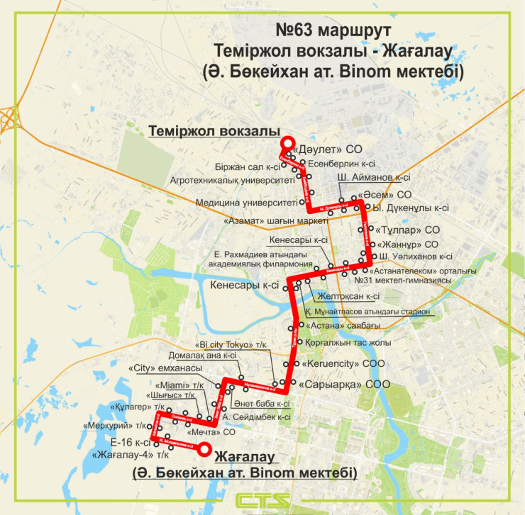 Данный маршрут будет курсировать сообщением Железнодорожный вокзал - Жагалау (Школа Binom имени Бокейхана). Он охватит Агротехнические и Медицинские университеты, ТРЦ "Сарыарка", Keruencity, район рынка "Астаналық", ТЦ "Тұлпар", ТД "Шапағат", "Асем" и "Сарыарка".