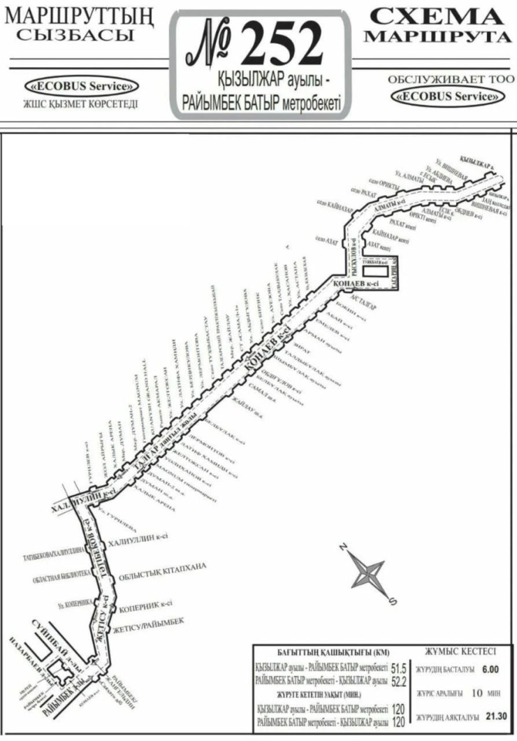 На маршруте № 252 задействовано 25 единиц подвижного состава с плановым интервалом 10 минут. Обслуживанием маршрута занимается перевозчик ТОО ECOBUS SERVICE.