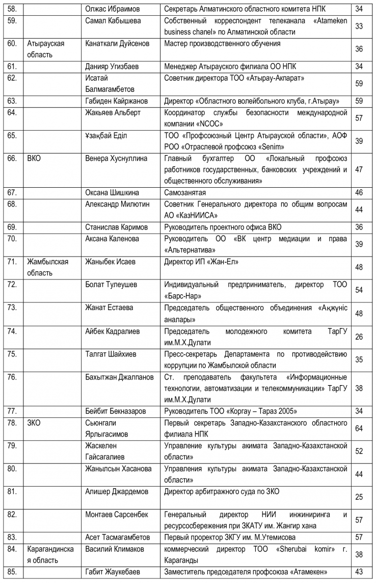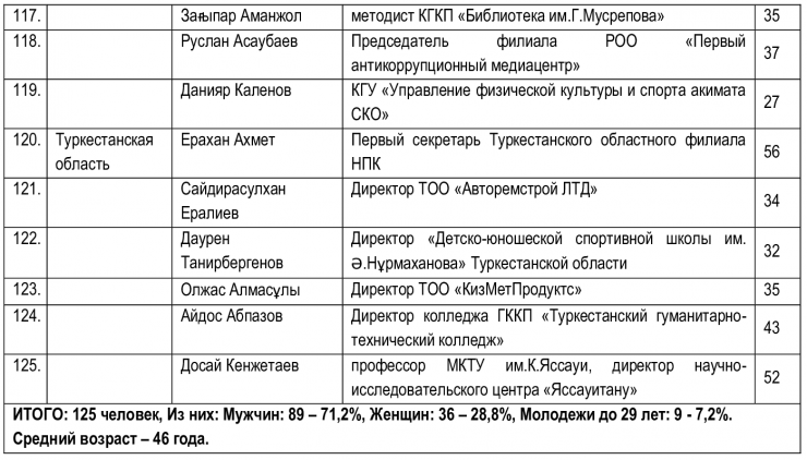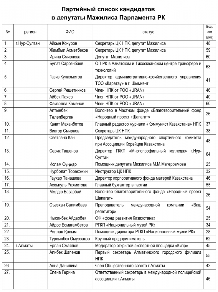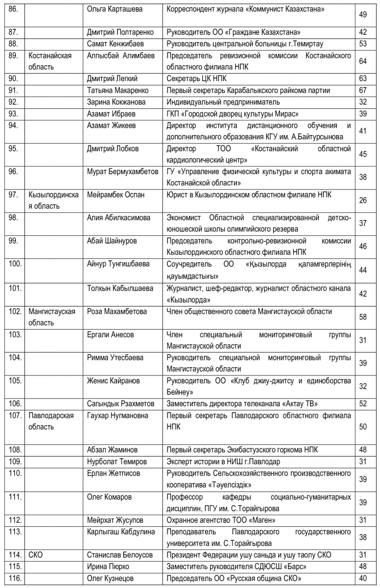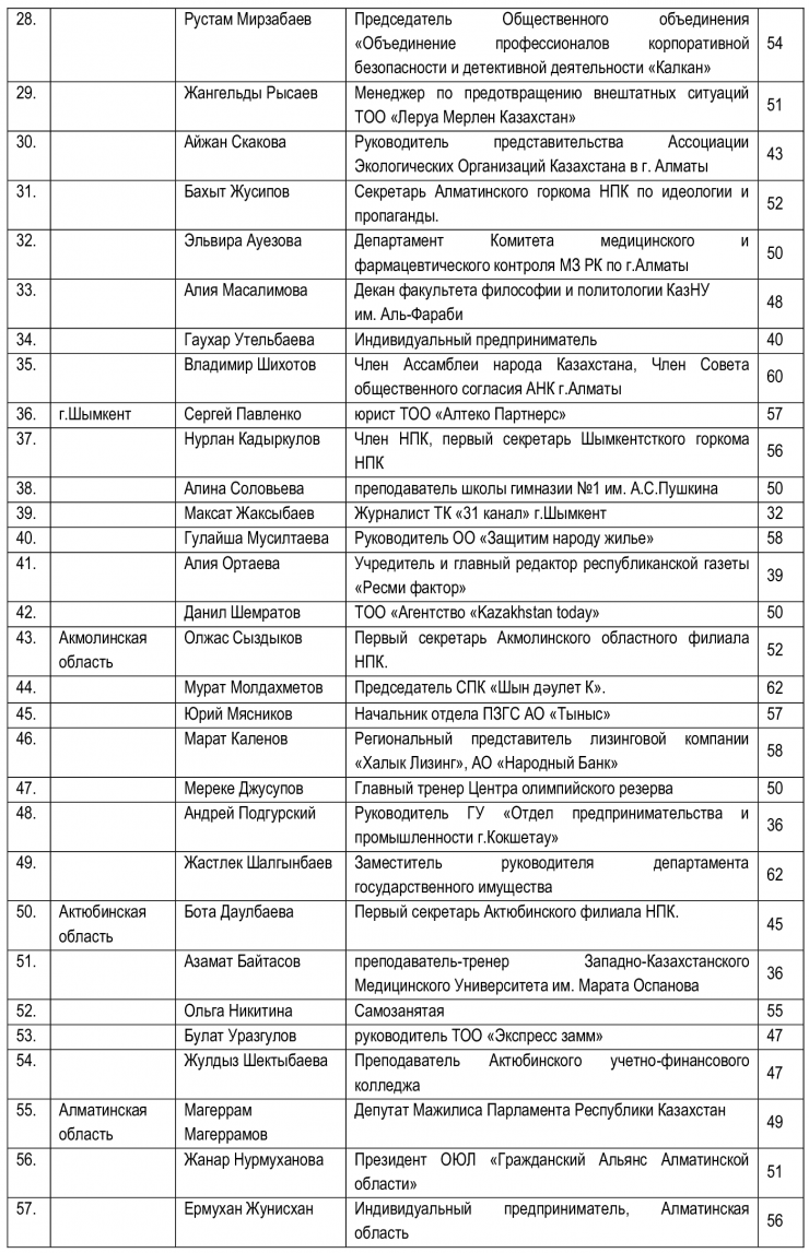 В список включены действующие депутаты Мажилиса Айкын Конуров, Жамбыл Ахметбеков, Ирина Смирнова и Магеррам Магеррамов. Кроме того, в него вошли: индивидуальные предприниматели, представители общественных организаций, журналисты, госслужащие, сотрудники различных компаний.