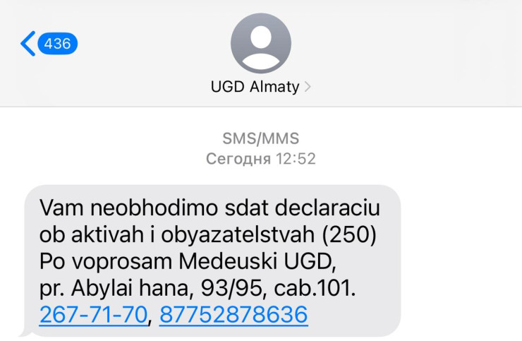 "Да, действительно, органы государственных доходов начали отправлять SMS-уведомления в адрес налогоплательщиков о необходимости предоставления декларации об активах и обязательствах по форме 250.00.