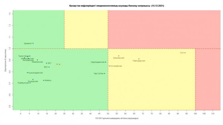 По данным матрицы оценки эпидемиологической ситуации в регионах Казахстана на 15 декабря, в "красной" зоне по-прежнему нет ни одного региона.