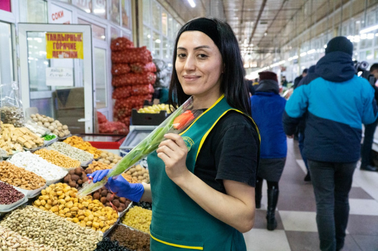 Сегодня акция прошла на территории ТК "Астаналык", где волонтеры подарили тюльпаны работницам торгового комплекса и тепло поблагодарили.