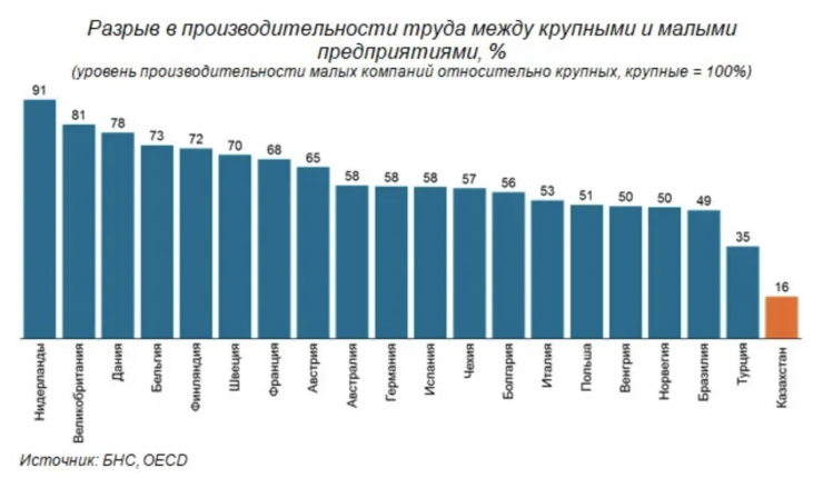Это также низкая производительность. Производительность труда работников крупных предприятий Казахстана в 5 раз выше, чем у МСБ. Для сравнения: в мире этот разрыв в среднем составляет менее 2 раз, а в развитых странах – от 20 до 40 процентов.