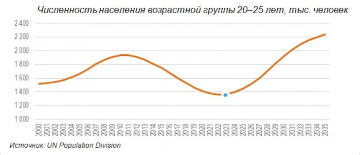 Уже в ближайшее время на рынок труда выйдут "бэби-бумеры", и численность основной возрастной группы рынка труда (20–25 лет) начнет расти. В течение 5 лет нужно обеспечить работой 1,3 млн молодых людей, к 2030 году – 1,7 млн, а до 2035-го – 2 млн! Это влечет за собой как возможности, так и риски.