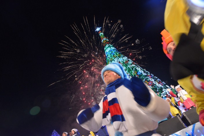 К слову, высота главной новогодней елки - 25 метров. Она украшена мишурой, шарами, которые обтянуты фольгой. В ночное время на ней можно увидеть светящиеся гирлянды.