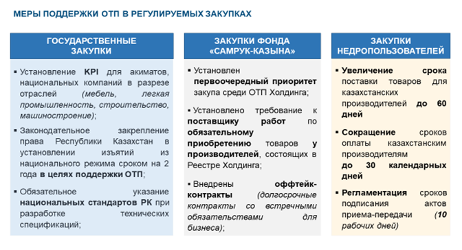 Руководитель Комитета обрабатывающей промышленности Владимир Бобров уверен в действенном механизме заключения долгосрочных договоров на взаимном принятии сторонами отлагательных обязательств: поставщик обязуется поставить товар собственного производства, а заказчик обязуется приобрести и оплатить поставленный товар. Сейчас возможности для заключения таких контрактов есть только в Фонде "Самрук-Казына", где общий объем закупок в прошлом году достиг 4,4 триллиона тенге.