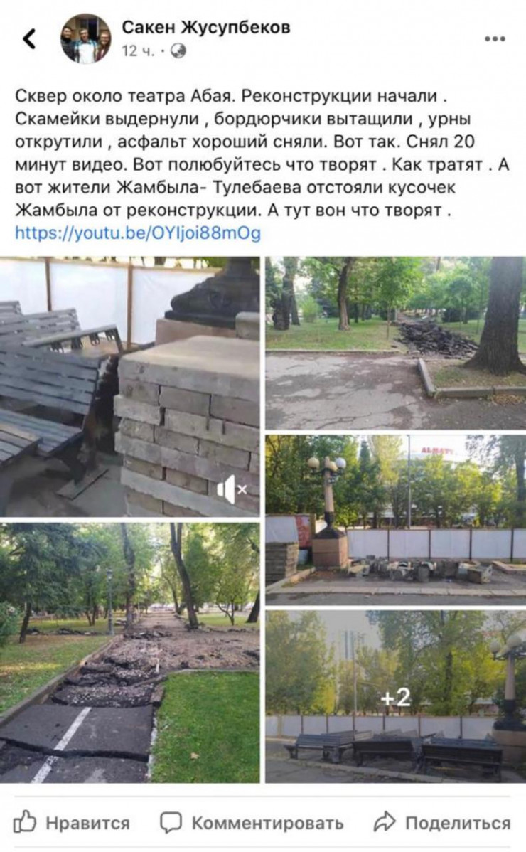 "Акимат Алматы! Вы знаете, что продолжается смена бордюров? Новых на новые. Двор дома Гагарина, 200. Может быть, хватит пировать во время чумы? Займитесь реальными делами и помощью людям", - написала Ирина Смирнова в Facebook.