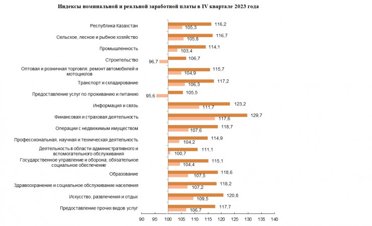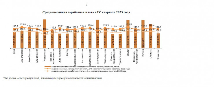 Согласно данным, среднее значение номинальной заработной платы по Казахстану в ІV квартале 2023 года составило 393 605 тенге. Рост к соответствующему кварталу 2022 года составил 16,2 процента, в реальном выражении увеличение – на 5,3 процента.