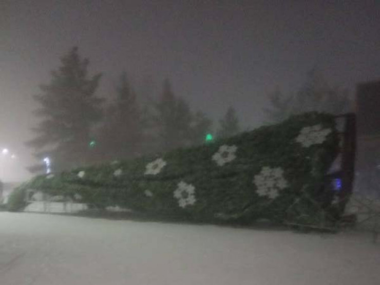 Из-за сильного ветра рухнула городская новогодняя елка, установленная в Лисаковске.