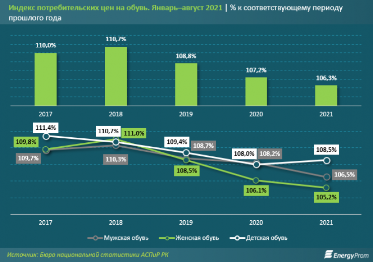Аналитики отметили, что по итогам восьми месяцев (январь–август) текущего года цены на обувь увеличились по сравнению с аналогичным периодом прошлого года на 6,3 процента. При этом темп роста цен несколько замедлился: в 2020 году удорожание в сегменте в аналогичном периоде составляло 7,2 процента за год, в 2019-м - 8,8 процента, а в 2018-м - сразу 10,7 процента.