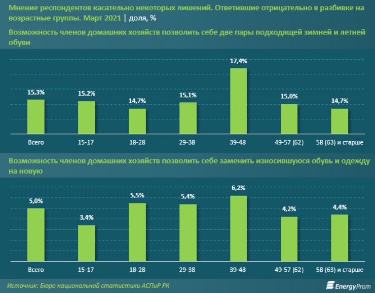 Аналитики также отметили, что среди различных возрастных групп чаще всего упоминали о невозможности позволить себе две пары зимней и летней обуви казахстанцы в возрасте от 39 до 48 лет (17,4 процента, реже всего - в возрасте от 18 до 28 лет, а также пенсионеры (по 14,7 процента).