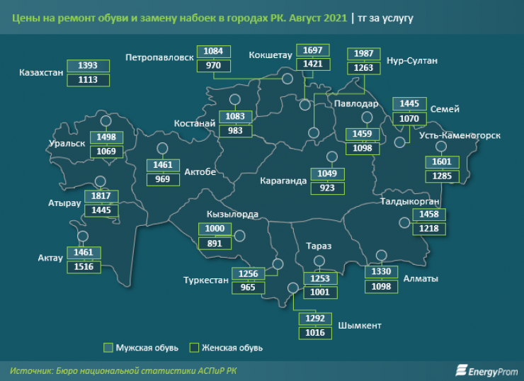 Тем временем средняя стоимость ремонта мужской обуви в городах страны в августе текущего года составила 1393 тенге, а женской - 1113 тенге. Дешевле всего отреставрировать обувь можно в Кызылорде, как мужскую (1000 тенге), так и женскую (891 тенге), а также в Караганде (мужскую - за 1049 тенге, женскую - за 923 тенге).