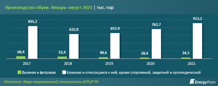 Производство обуви в Казахстане по сравнению с прошлым годом увеличилось, составив за январь–август текущего года 913,2 тысячи пар (+19,7 процента) кожаной и 34,3 тысячи пар (+20,8 процента) - валяной и фетровой обуви.