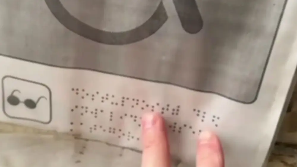 Объявление у входа в здание предназначалось для людей с инвалидностью по зрению. Текст на нем был написан шрифтом Брайля, но загвоздка заключалась в том, что листок этот распечатан на принтере и буквы, которые должны быть выпуклыми, чтобы их можно было прочесть, получились просто "нарисованными". В кадре также можно заметить табличку участкового пункта полиции.