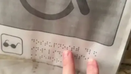 Объявление у входа в здание предназначалось для людей с инвалидностью по зрению. Текст на нем был написан шрифтом Брайля, но загвоздка заключалась в том, что листок этот распечатан на принтере и буквы, которые должны быть выпуклыми, чтобы их можно было прочесть, получились просто "нарисованными". В кадре также можно заметить табличку участкового пункта полиции.