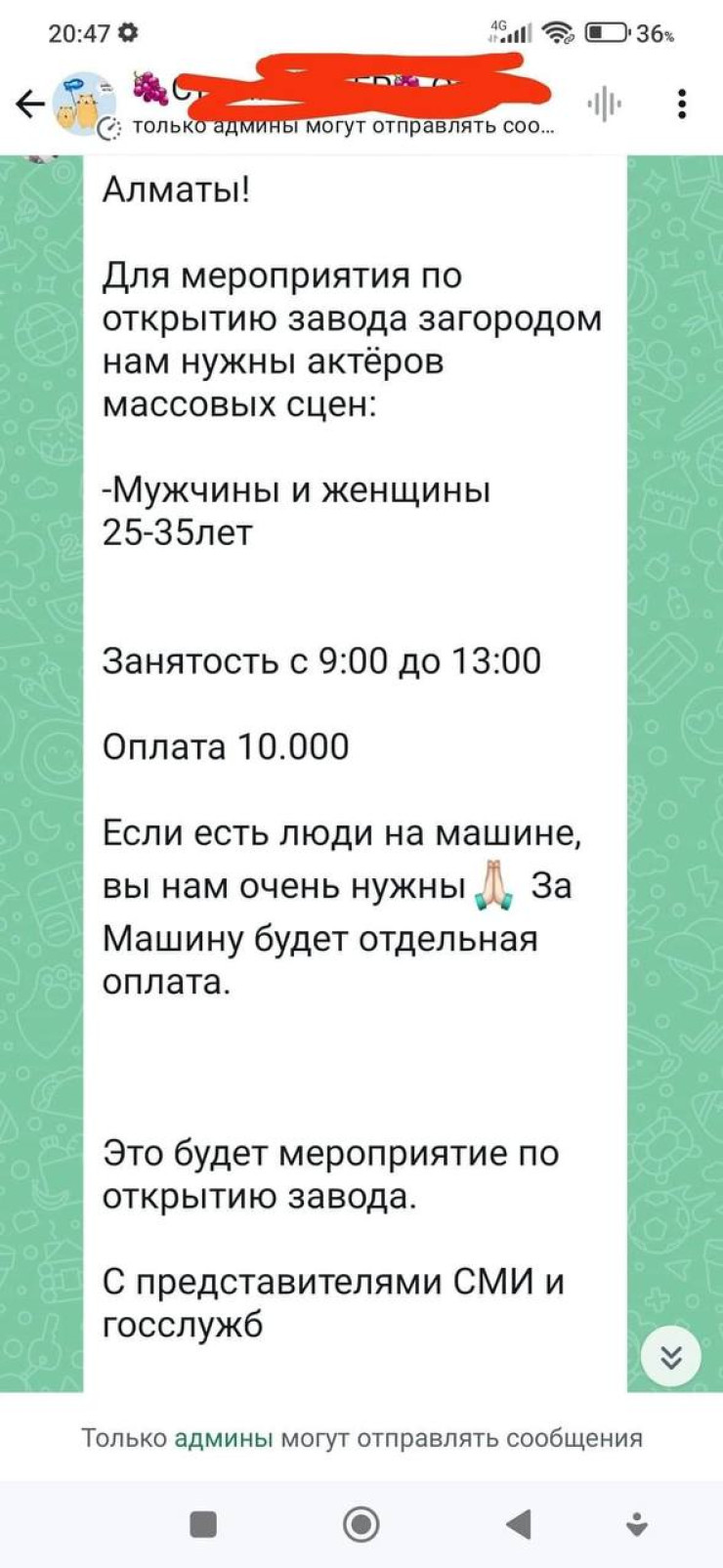 В Казнете обсуждают объявление по набору актеров на открытие нового завода в Алматы, передает корреспондент Tengrinews.kz. Объявление о кастинге было размещено в одном из Telegram-каналов по найму.