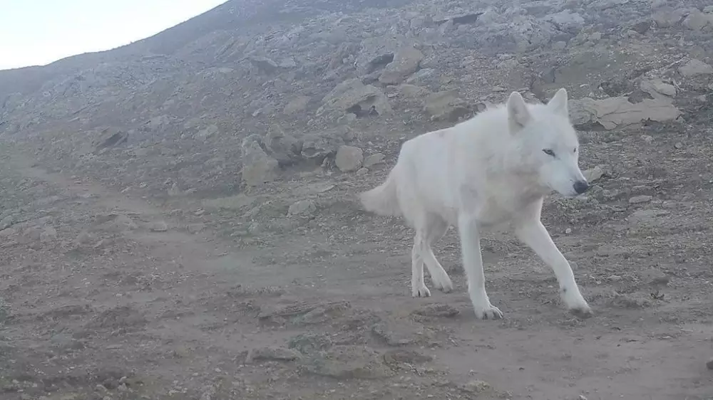 Зверь попал в фотоловушку 27 декабря 2023 года. Специалисты Мангистауского областного управления природопользования рассказали, что белый волк очень редкий хищный зверь в Мангистау.