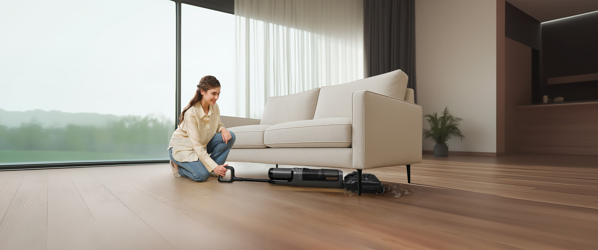 Ещё одна типичная бытовая проблема – зоны под кроватями, диванами, шкафами, куда обычный вертикальный пылесос не может "заехать". Именно здесь на сцену выходит складная на 180 градусов конструкция Tineco FLOOR ONE i6 Stretch Plus, которая позволяет пылесосу буквально ложиться на пол и аккуратно проходить под мебелью, где накапливаются скрытая пыль, шерсть и мусор. Благодаря этому можно провести качественную уборку "слепых зон", ничего не переставляя в процессе.