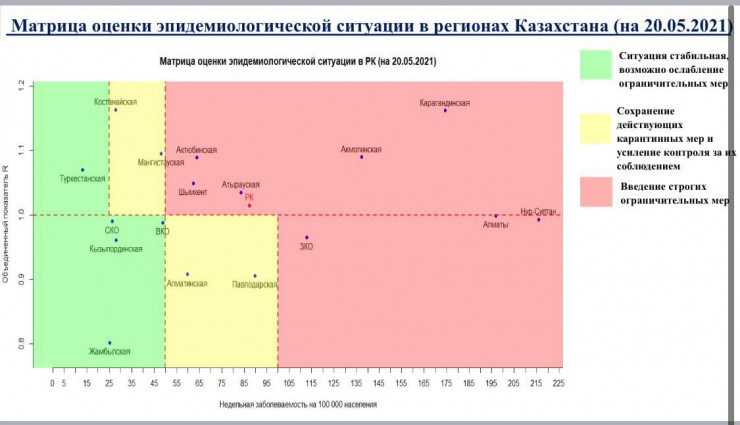 Так, 20 мая в "красной" зоне по-прежнему находятся Нур-Султан, Алматы, Шымкент, Акмолинская, Атырауская, Актюбинская, Западно-Казахстанская, Карагандинская области. Здесь же остается в целом Казахстан.