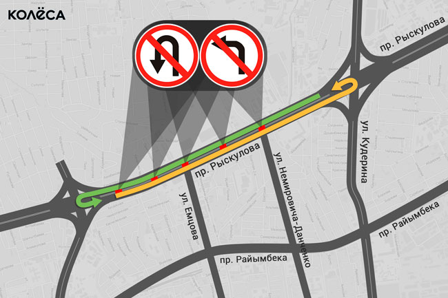 Для того чтобы повернуть в сторону центра города, водителям, двигающимся по Рыскулова в западном направлении, необходимо проследовать до развязки на пересечении с улицей Саина и там развернуться. Соответственно, тем, кто едет по проспекту в восточном направлении, для того чтобы уйти в нижнюю часть мегаполиса, придется доехать до развязки на пересечении с Кудерина (и Северным кольцом). При этом левые повороты на проспект с улиц, пересекающих Рыскулова, не запрещены, уточнили в управлении дорожного надзора местной полицейской службы Алматы.