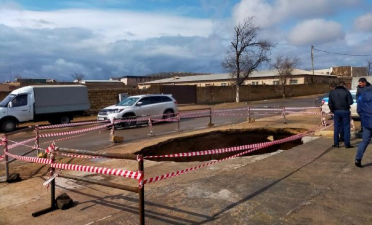 Провалившееся асфальтное покрытие сняли на видео сегодня, 26 марта, у сервиса по шиномонтажу около гаражно-строительного кооператива "Строитель" в 21-м микрорайоне Актау, передает Tengrinews.kz со ссылкой на Lada.kz.