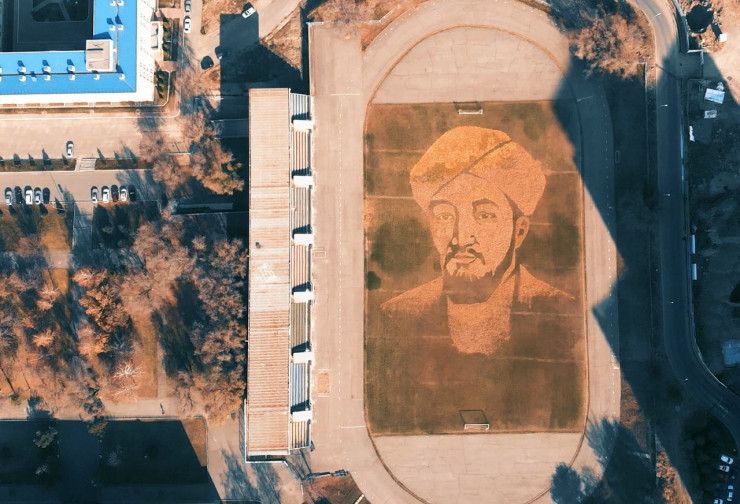 Стадион КазНУ украсило рукотворное чудо - грандиозный портрет аль-Фараби, впечатляющий своими размерами - высотой 76 метров и шириной 66 метров. Участники необычного творческого флэш-моба считают, что это самое большое изображение великого мыслителя в мире. А на его создание их вдохновило происхождение аль-Фараби, родившегося на казахской земле, и его богатое творческое наследие, давшее начало европейскому средневековому Ренессансу", - добавили в вузе.