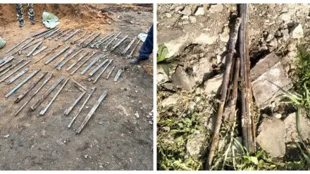 В ведомстве сообщили, что полицейские, несущие дежурство на данном участке, разбили фундамент и извлекли из него 46 ружейных стволов и детали охотничьего оружия.