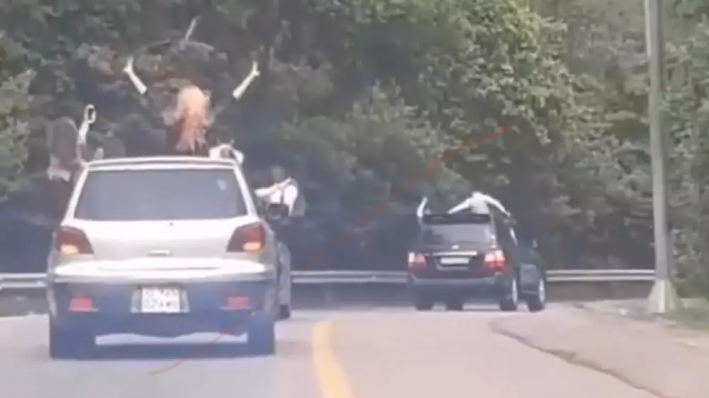 На видео показаны девушки и парни, которые по пояс высовываются из окон петляющих в стороны машин.