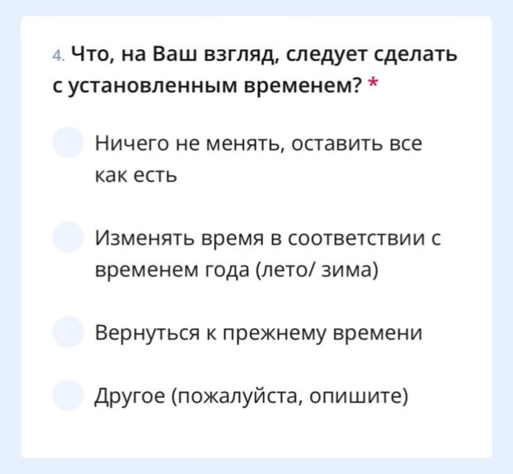 Также жителям республики предлагают ответить на вопрос, что следует сделать с установленным временем. Среди вариантов ответов: "Ничего не менять, оставить все как есть", "Изменять время в соответствии с временем года (лето/зима)", "Вернуться к прежнему времени". Также предлагается указать свой вариант ответа.