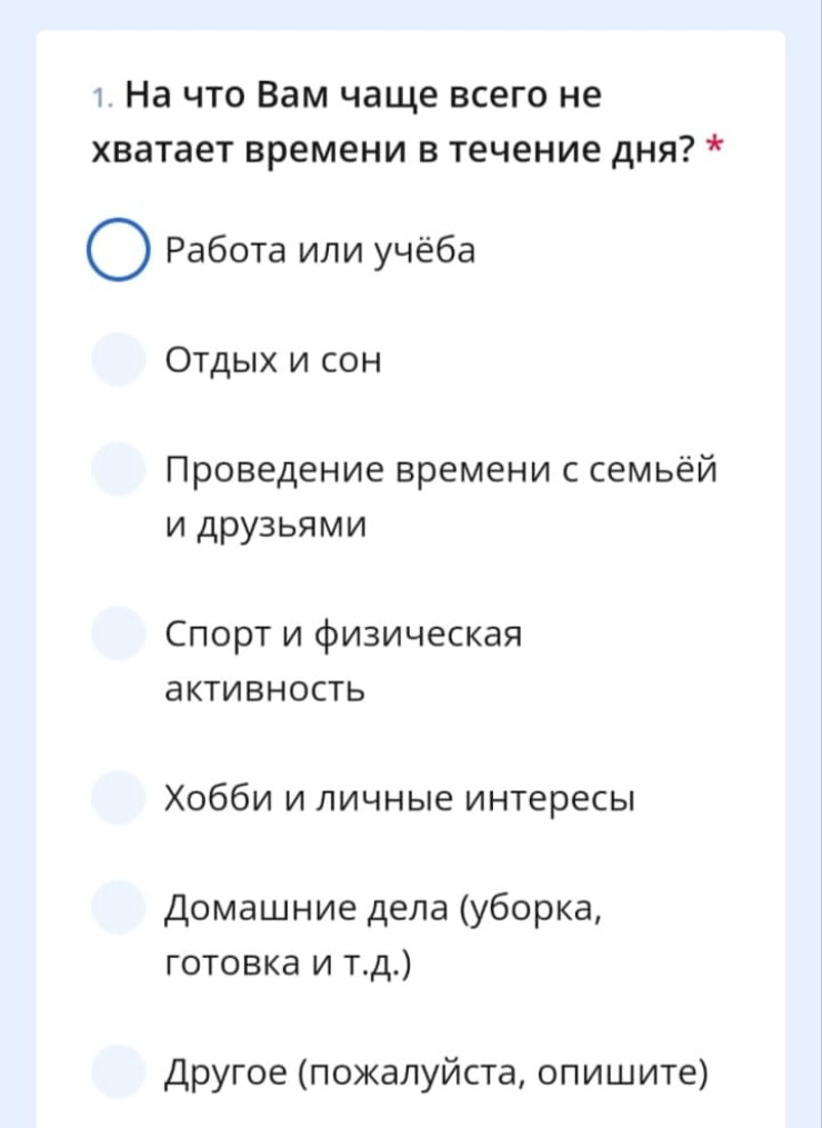 Кроме этого, у пользователей предложения спрашивают на что чаще всего не хватает времени в течение дня. Предлагаются такие варианты ответов, как "Работа или учеба", "Отдых и сон", "Проведение время с семье и друзьями", "Спорт и физическая активность", "Хобби и личные интересы", "Домашние дела", а также свой вариант.