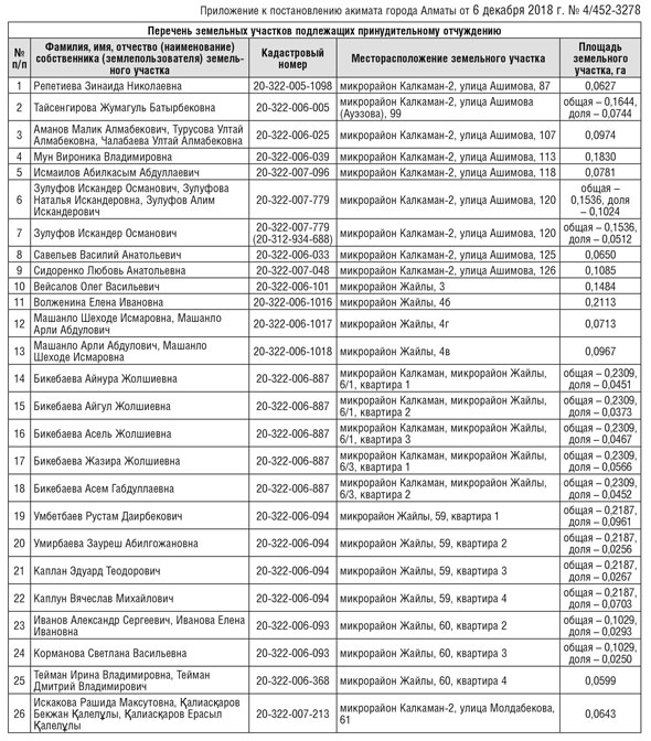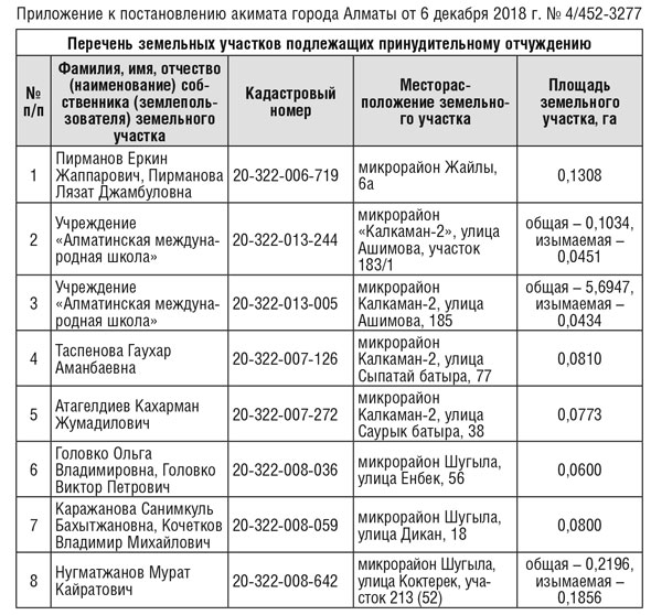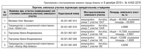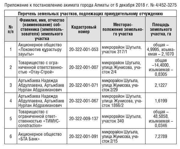 По всем вопросам собственники изымаемых земель могут обратиться в исполнительный орган - Управление земельных отношений Алматы (УЗО) по адресу: улица Толе би, 155, кабинет 514.