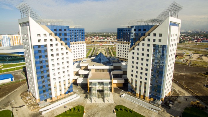Атлетическая деревня - жилой комплекс, который состоит из 14 зданий и трех блоков обслуживания, расположенных в виде английской буквы U (Universiade). По архитектурному замыслу все объекты образуют силуэт Солнечного человека, известного по изображению на древних наскальных рисунках.