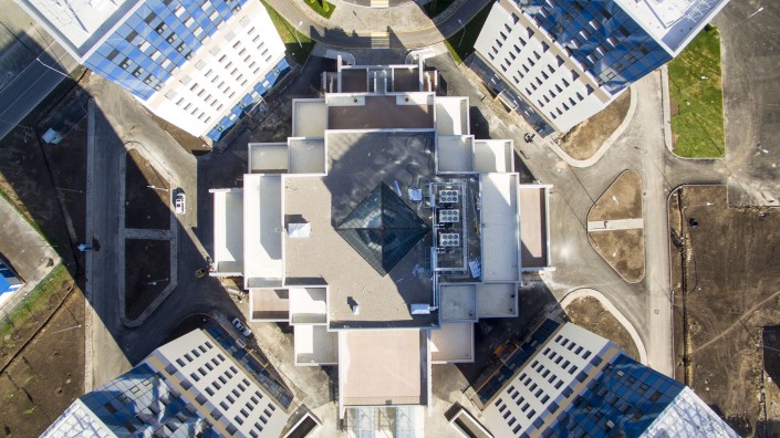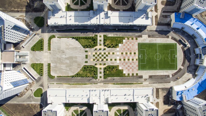 Между 14-этажными жилыми зданиями расположен главный административный центр - операционный блок, в котором во время Универсиады будет располагаться офис организаторов FISU, столовая, рассчитанная на обслуживание 1 000 человек, зона отдыха. Здесь организован музей традиционных музыкальных инструментов с использованием интерактивных технологий.