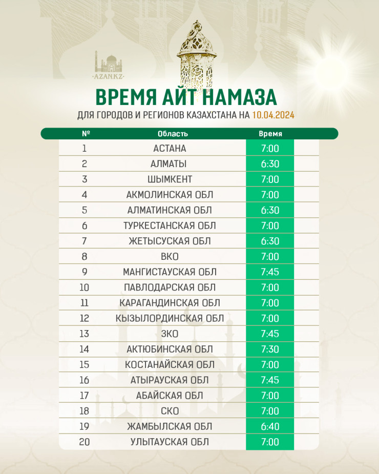 В Жамбылской области время начала праздничной молитвы - 06:40, в Актюбинской области - в 07:30.