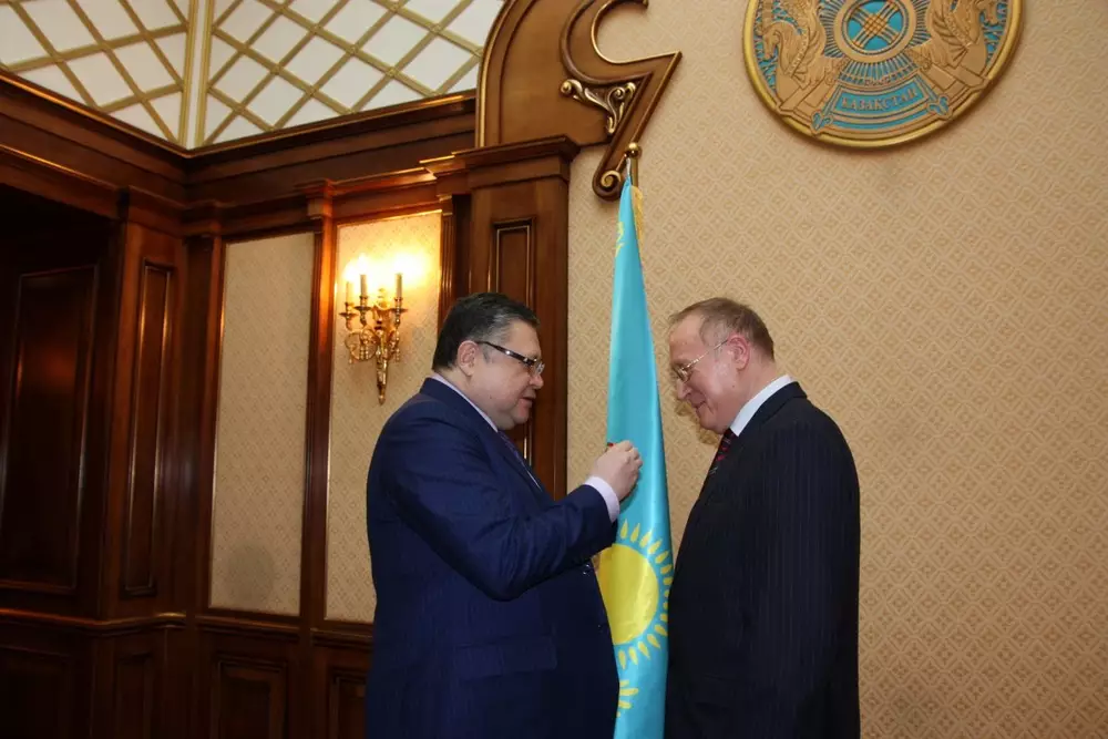 "Указом Президента Республики Казахстан Евгений Бажанов удостоен высокой награды за заслуги в государственной и общественной деятельности, значительный вклад в социально-экономическое и культурное развитие страны, укрепление дружбы и сотрудничества между народами", - говорится в сообщении. Почетный знак Евгению Бажанову вручил чрезвычайный и полномочный посол Казахстана в Российской Федерации Марат Тажин.