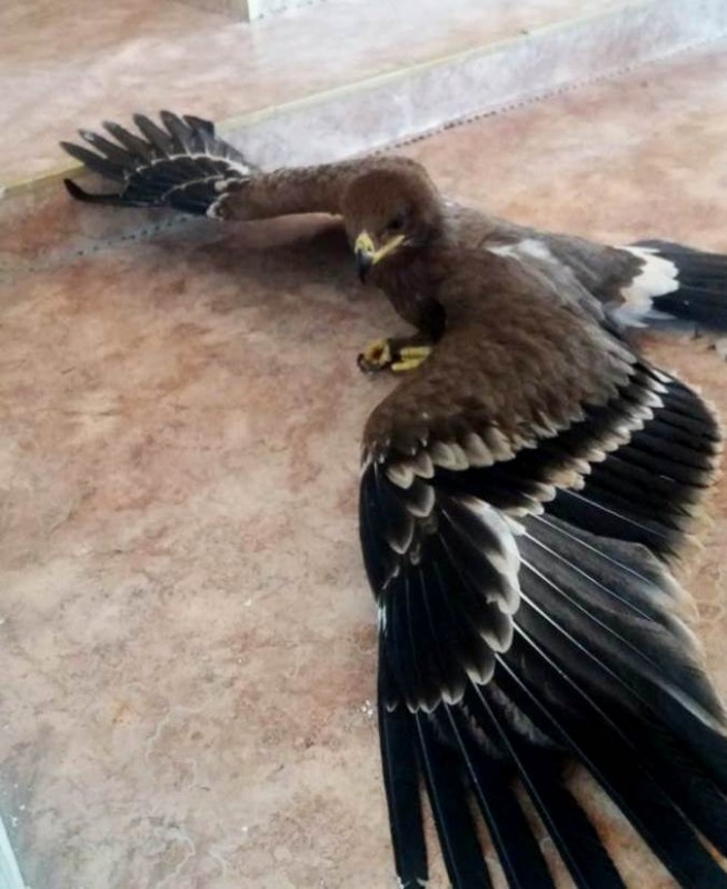 Орнитолог заповедника "Акжайык" Илья Бофонов сообщил, что это молодой степной орел в возрасте примерно 5-6 месяцев. При первичном визуальном осмотре механических повреждений крыльев и ног не наблюдается. Однако сложилось впечатление, что ноги орла сведены судорогой. Предположительно - от удара током высоковольтной линии электропередач, на которую могла сесть птица. Более точный диагноз установят ветеринары.