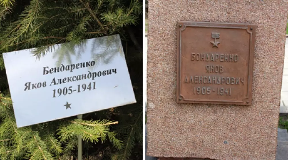Яков Бондаренко на табличке значится, как "Бендаренко". В акимате Медеуского района Алматы, который отвечал за посадку именных елей, отмечают, что об ошибках не знали.