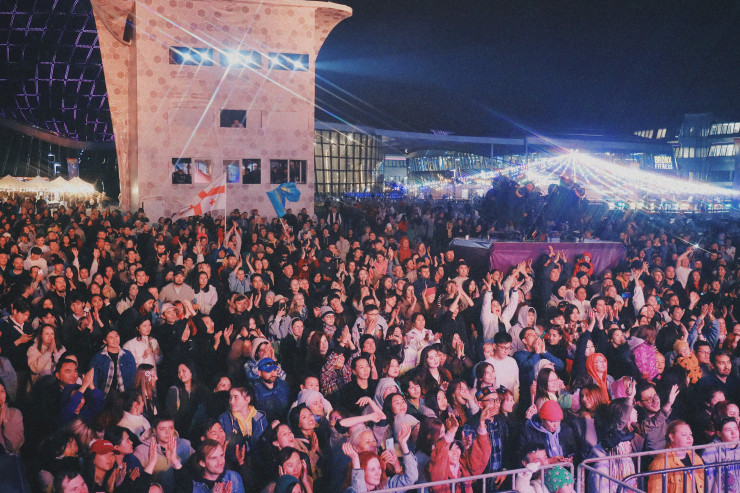 Ну а вишенкой на торте для астанчан стало выступление грузинской группы MGZAVREBI. Ее ждали. Ей подпевали. Размахивали флагом Грузии. И отрывались под грузинские мотивы. Устоять на месте было просто невозможно. К этому времени Астана уже прилично погрузилась в сумерки. Шар "Нур Алем" стал еще более завораживающим, переливаясь разными цветами и геометрическими фигурами. Публики стало еще больше.