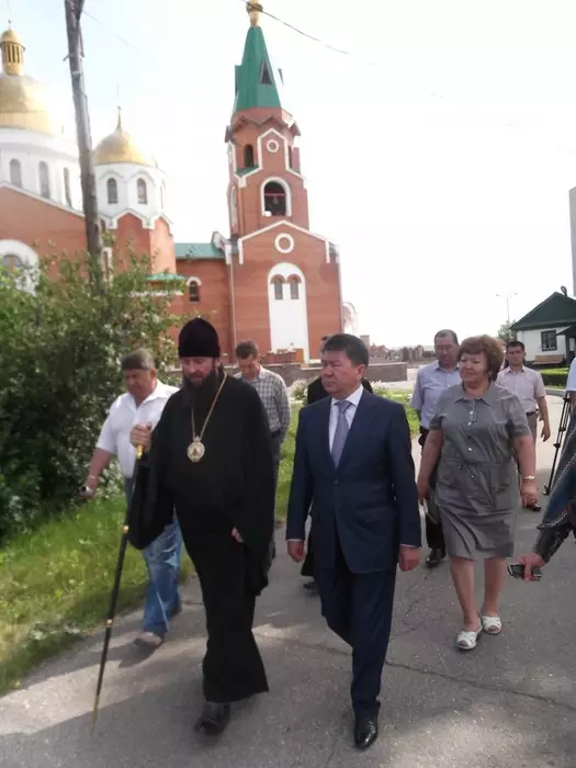 Владыка Амфилохий пригласил акима пройти по территории, где расположен мужской монастырь и ведется широкомасштабная реконструкция Свято-Троицкого храма, построенного в 1799 году. Культовое сооружение считается одним из старейших на территории Восточно-Казахстанской области. Во время реконструкции подвальных помещений рабочие наткнулись на склеп, где была погребена русская княгиня - супруга первого коменданта крепости Усть-Каменной. Верующая женщина умерла внезапно и рано. Неподалеку были обнаружены три могилы священников.
