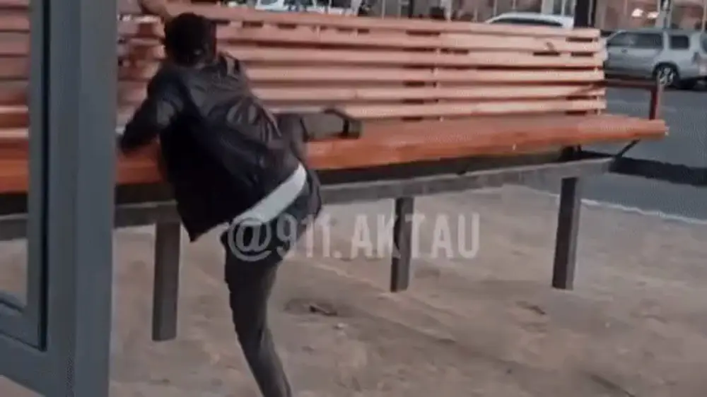На видео видно, как взрослый мужчина пытается забраться на лавочку, установленную на автобусной остановке. Устроиться поудобнее в ожидании автобуса местному жителю удалось не сразу.