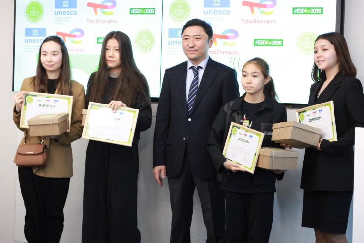 Награды молодым финалистам и победителям "Зеленой олимпиады" вручал министр энергетики, президент Казахстанской федерации клубов ЮНЕСКО Болат Акчулаков.