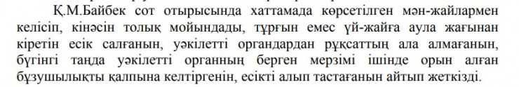 Байбек-старший также пояснил, что уже устранил нарушение и незаконный дверной проем был демонтирован. Суд признал его виновным и приговорил к штрафу в размере 51 750 тенге.