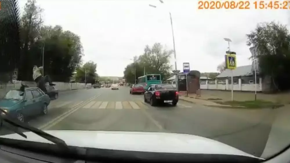 Наезд на пешехода произошел в 15.49 в районе остановки "16-й магазин" и попал на видеорегистратор очевидцев. На записи видно, как двое мужчин в спешке пытаются перейти дорогу. В этот момент по проезжей части едут несколько автомобилей.