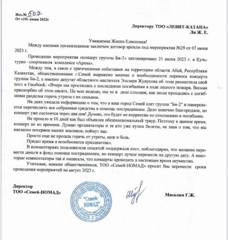 В акимате предоставили скан-копию письма, которую представители "Арены" отправили организаторам концерта в Семее 19 июня.