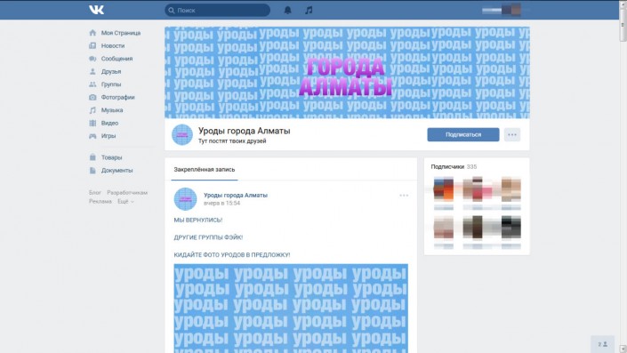 Группа "Уроды Алматы" во "ВКонтакте" заблокирована по требованию Комитета государственного контроля в области связи, информатизации и средств массовой информации Министерства информации и коммуникаций Республики Казахстан, передает Tengrinews.kz.