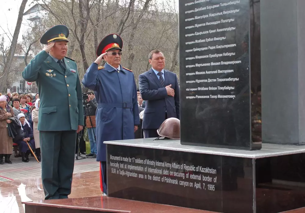 Монумент установлен в парке имени Абая, куда местные жители - ветераны войны, офицеры Национальной гвардии, военные и студенты пришли почтить память тех, кто 20 лет назад погиб в боях в районе Пшихаврского ущелья. Тогда, выполняя свой интернациональный долг, погибли 17 солдат внутренних частей РК. Кровавая бойня произошла 7 апреля 1995 года.