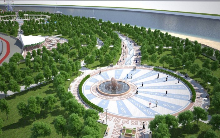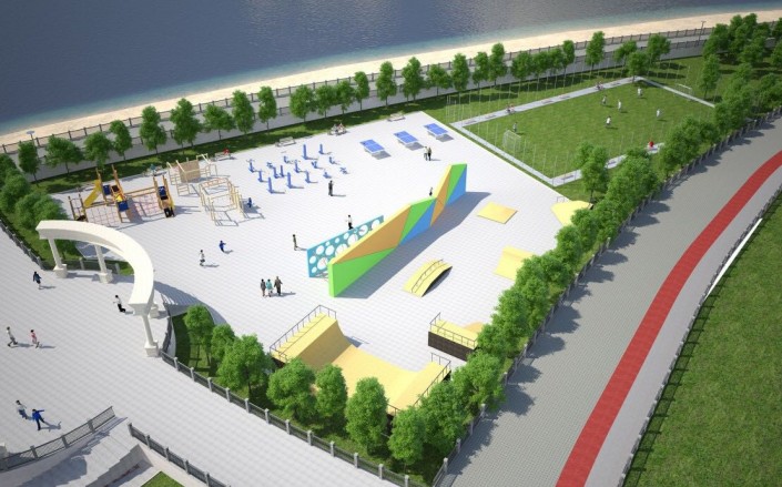 В парке будут расположены колесо обозрения высотой 55 метров, карусели, детские игровые площадки, мини-футбольное поле, площадка для streetworkout, скейтбординга, пешеходный фонтан длиной около 300 метров, пешеходные и велодорожки.